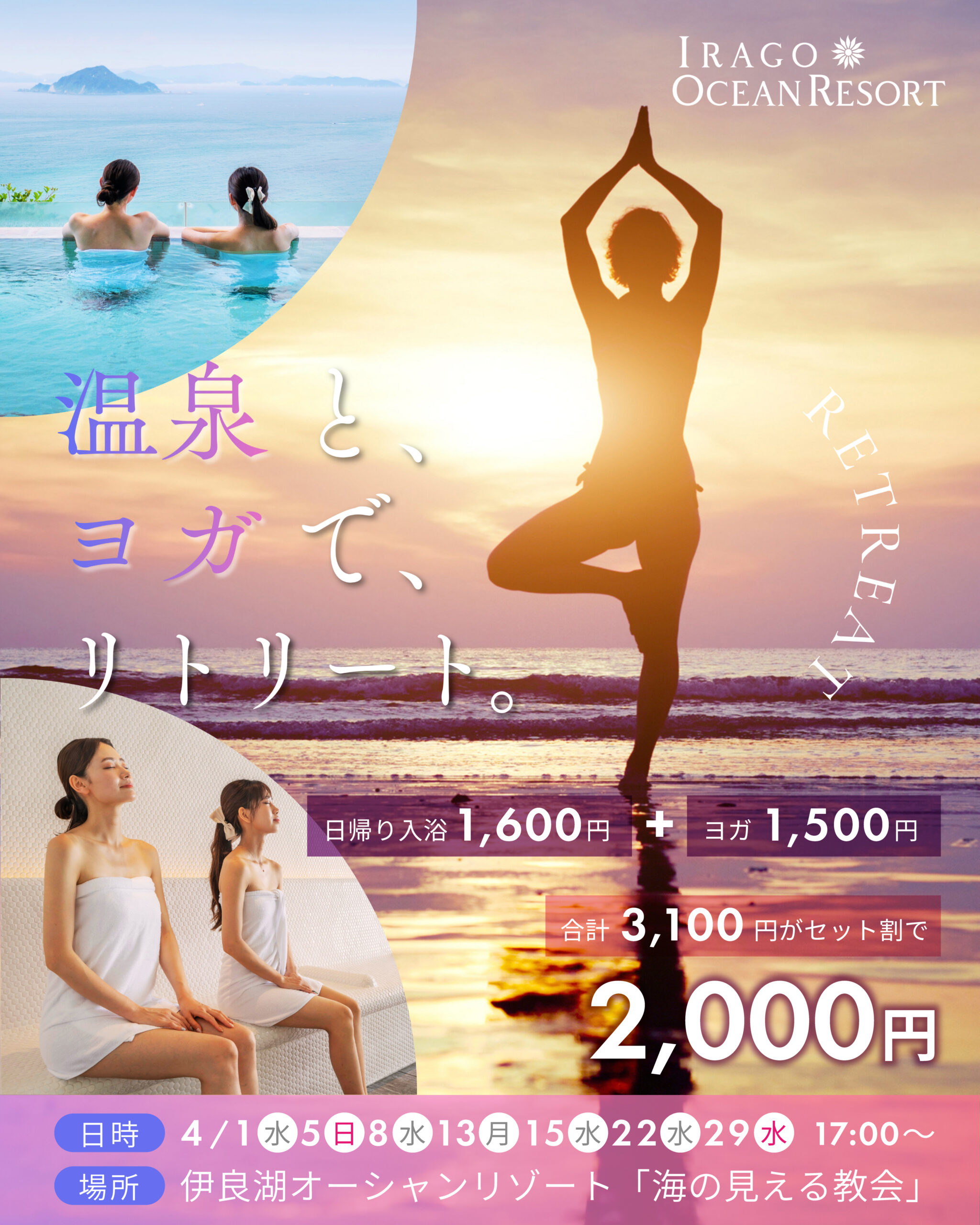 Normally, a day trip to the hot springs costs 1,600 yen + yoga costs 1,500 yen, for a total of 3,100 yen, but we are offering it at the special price shown above!
